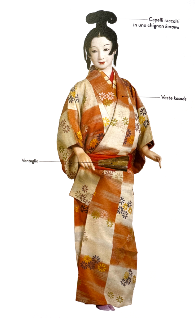 In questo breve ma significativo periodo, l’abbigliamento femminile fu influenzato da una crescente prosperità economica e da scambi culturali. I tessuti divennero più lussuosi e decorati con motivi audaci e colori vivaci. Il kosode continuò a essere l’indumento principale, spesso abbinato a un obi ancora più largo e ornato.
