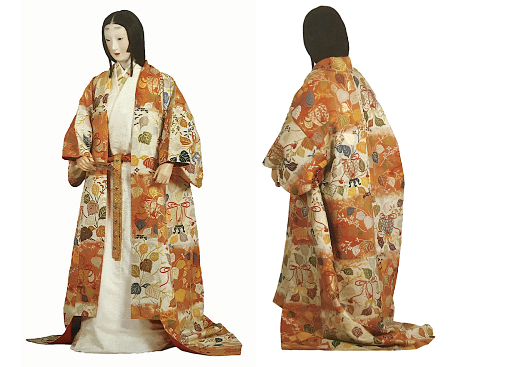 La più celebre veste di questo periodo è certamente il Jūnihitoe 十二単, letteralmente 12 strati, ovvero un abito formale usato soltanto dalle dame di corte che con tutti i suoi strati arriva a pesare fino a 20 chilogrammi. Ogni strato ha un nome specifico che risparmio al lettore ma vi cito solo la parte superiore chiamata karaginu, letteralmente veste cinese, reminiscenza del periodo precedente. Oggi non viene più utilizzato se non dalla casata imperiale in rare occasioni. L’ultima è stata l’incoronazione dell’imperatore Naruhito nel 2019 quando le donne della famiglia imperiale e le loro dame di compagnia indossavano tutte il jūnihitoe. In quell’occasione l’imperatore, il principe ereditario Akishino e i loro gentiluomini di compagnia, indossavano il sokutai, l’abito formale maschile dell’antica corte giapponese.