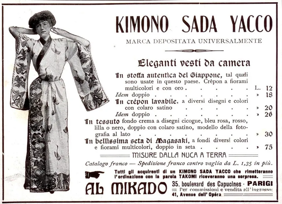 Una testimonianza della fascinazione per il Sol Lavante di inizio ‘900 furono anche le pubblicità della così nominata “Elegante veste da camera” venduta dalla francese Al Mikado che costantemente si trovavano nelle riviste di tutta Europa. In Italia le troviamo nella rivista culturale “La Scena Illustrata”.