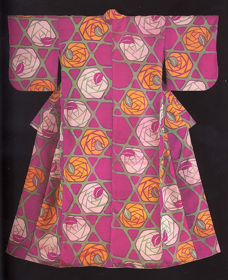 Questo kimono si caratterizzava per la combinazione di una seta meno costosa e di una tecnica di stampa e tessitura a stencil, una manifattura quindi più economica che per la prima volta permise a molte donne di avere un kimono in seta. La tecnica utilizzata era l’ikat (kasuri in giapponese), tecnica di origine indiana e importata in Giappone a fine ‘800 dove parti dei filati vengono protette tramite una stretta legatura per non essere tinte. Rispetto all’antico shibori, la tintura si applica sul filo, prima che il tessuto diventi tale. Questo permette la creazione in serie di motivi geometrici facilmente serializzabili, quindi meno artigianale e di più semplice e veloce realizzazione.